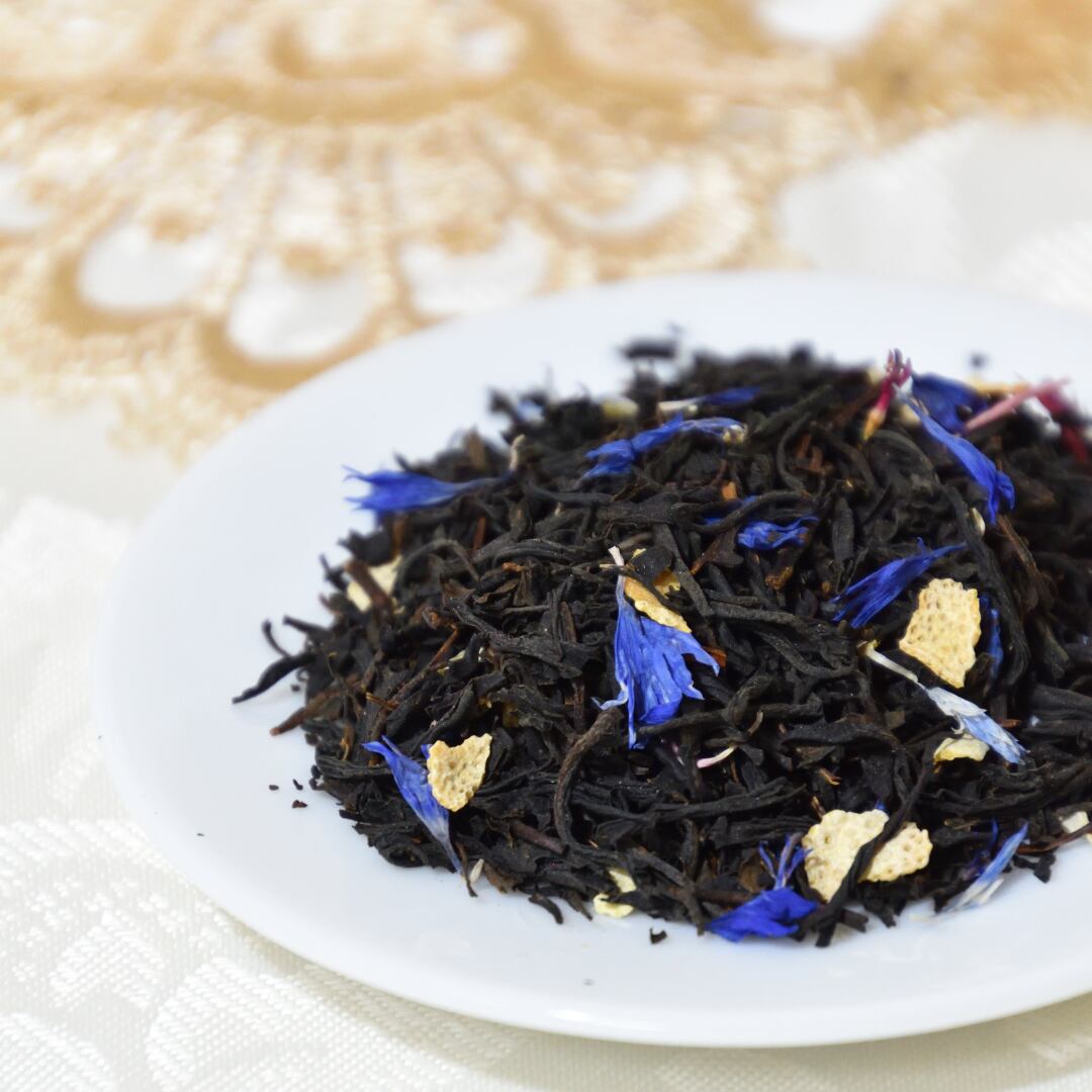 〈紅掛藤 × コーンフラワー〉は、ベルガモットの上品な香りと鮮やかな青の花びらが美しい一杯。
